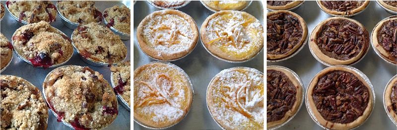 Fall/winter pies: Apple Crumble, Cranberry-Apple (with or without nuts), Blood Orange(December-March), Meyer Lemon (November-March), Pumpkin-Praline, Maple Pecan, Bourbon Chocolate Pecan, Eggnog